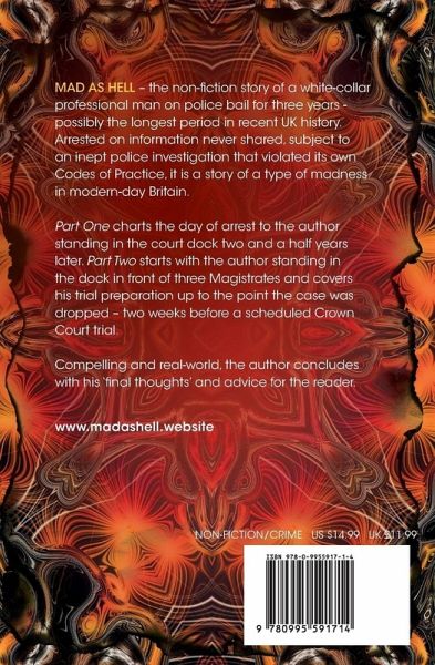 MAD AS HELL – the non-fiction story of a white-collar professional man on police bail for three years - possibly the longest period in recent UK history. Arrested on information never shared, subject to an inept police investigation that violated its own Codes of Practice, it is a story of a type of madness in modern-day Britain. Part One charts the day of arrest to the author standing in the court dock two and a half years later. Part Two starts with the author standing in the dock in front of three Magistrates and covers his trial preparation up to the point the case was dropped – two weeks before a scheduled Crown Court trial. Compelling and real-world, the author concludes with his ‘final thoughts’ and advice for the reader.