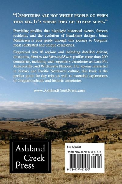 Mad as the Mist and Snow is a traveler's guide to Oregon's most celebrated and unique cemeteries Organized into 18 regions and including detailed driving directions, this book profiles more than 200 cemeteries, including such legendary cemeteries as Lone Fir, Jacksonville, and Willamette National. Much more than a travel guide, this book illustrates how cemeteries have evolved and how Oregon's cemeteries are still evolving. Author Johan Mathiesen has traveled to each and every one of these cemeteries and provides detailed profiles that highlight unique historical events, famous residents, and the evolution of headstone designs. Mathiesen also highlights which cemeteries around the state should be on every traveler's and historian's "must visit" list -- and why. Mad as the Mist and Snow, written for anyone interested in history, cemeteries, and Pacific Northwest culture, is the perfect guide for both day trips as well as extended explorations of Oregon's eclectic and historic cemeteries.