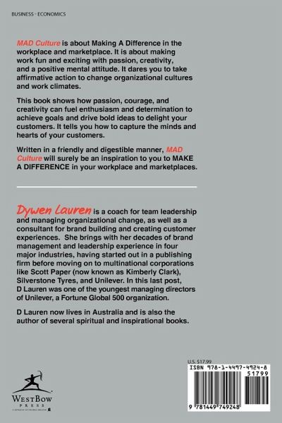 MAD Culture is about Making A Difference in the workplace and marketplace. It is about making work fun and exciting with passion, creativity, and a positive mental attitude. It dares you to take affirmative action to change organizational cultures and work climates. This book shows how passion, courage, and creativity can fuel enthusiasm and determination to achieve goals and drive bold ideas to delight your customers. It tells you how to capture the minds and hearts of your customers. Written in a friendly and digestible manner, MAD Culture will surely be an inspiration to you to MAKE A DIFFERENCE in your workplace and marketplaces.