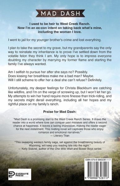 Mad Dash is the first installment in a contemporary Western romance saga. If you like witty characters, gritty storylines, intrigue, and heart-fluttering romance, then you'll love Sage Evans' series starter. I went to jail for my younger brother's crime and lost everything. I plan to take the secret to my grave, but my grandparents say the only way to reinstate my inheritance is to prove I've settled down from the volatile felon they think I am. My only hope is to impress everyone doubting my character by marrying my former flame and starting the family I've always wanted. Am I selfish to pursue her after she says no? Possibly. Does kissing her breathless make me a bad man? Maybe. Will I still scheme to offer her a deal she can't refuse? Definitely. Unfortunately, my deeper feelings for Christa Blackburn are catching like wildfire, and I'm on the verge of screwing up, but I won't let her go. My attempts to win her hand require more finesse than trick-riding, and my secrets might derail everything, including all her hopes and my rightful place on my family's ranch.