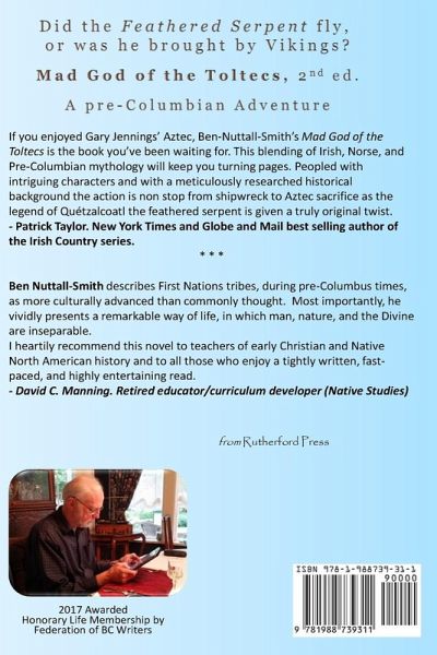 In his saga of a probable life of Quetzalcoatl of Mexico, Ben Nuttall-Smith gives life to scenes of Vikings, Irish monks, North American early peoples and Toltecs through his painter's eyes via his much research into local flora and fauna. His action-filled, often lethal encounters with varying dialogues spin from poems to prayers in Latin and other rituals, until the reader's imagination is fed enough to feel seasick on the Atlantic, or taste strange herbs, or be in awe of feather decorations. Nuttall-Smith is instructive and entertaining. Bernice Lever. Prize-winning poet and author This far-reaching novel eloquently displays the author's love of history and storytelling. Mad God of the Toltecs rampages from monastic life in the old world to exotic practices on a distant continent. En route the reader is treated to the lifestyles of impoverished Irish monks, marauding Vikings, the first nations in a new world and the early civilizations of what would one day become Central America. Ben Nuttall-Smith has crafted a fascinating tale of enormous scope. Anthony Dalton. Past National President Canadian Authors Association Author of numerous non-fiction books about the sea and about exploration