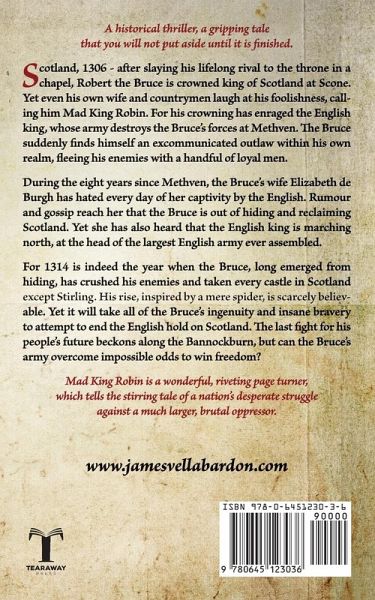 "Vella-Bardon has what it takes to become a literary giant" - Yorkshire Evening Post A historical thriller, a gripping tale that you will not put aside until it is finished. Scotland, 1306 - after slaying his lifelong rival to the throne in a chapel, Robert the Bruce is crowned king of Scotland at Scone. Yet even his own wife and countrymen laugh at his foolishness, calling him Mad King Robin. For the murder of the Bruce's rival in a chapel has enraged the English king in London, who views himself as Scotland's rightful ruler. An English army is sent north and through an act of deception, the Bruce's forces are destroyed at Methven. After the Bruce's narrow escape, his wife, daughter and sisters are captured by the English. The Bruce suddenly finds himself an excommunicated outlaw within his own realm, fleeing both his English and Scottish enemies with a mere handful of loyal men. For eight years since Methven, the Bruce's wife Elizabeth de Burgh, daughter of the most powerful man in Ireland, has hated every day of her captivity by the English. The walls of Rochester castle are a seemingly eternal prison, while rumour and gossip reaches her that the Bruce is out of hiding, and incredibly reclaiming castle after castle in Scotland. Yet word has also reached her that the English king is marching north, at the head of the largest English army ever assembled. All Elizabeth can do is cling to mad hopes of freedom, while her captors urge her to abandon her fealty to her husband. Yet 1314 is indeed the year when the Bruce, long emerged from hiding, has crushed his enemies and taken every castle in Scotland except Stirling. His rise, inspired by a mere spider, is scarcely believable. But even the Bruce privately fears the incredibly large English force marching north to crush him, which is more than twice the size of his own army. It will take all of the Bruce's ingenuity and insane bravery to attempt to end the English hold on Scotland once and for all. The last fight for his people's future beckons along the Bannockburn, but can the Bruce's army overcome impossible odds to win freedom? Mad King Robin is a wonderful, riveting page turner, which tells the stirring tale of a nation's desperate struggle against a much larger, brutal oppressor.
