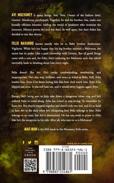 Avi Mulvaney is many things. Son. Twin. Owner of the fashion label, Gemini. Murderous psychopath. Together, he and his brother, Asa, make one brutally efficient monster, ridding the world of predators who victimize the innocent. History proves Avi and Asa don't do well apart, but their father has decided to test that theory.Felix Navarro knows exactly who he is. Baby brother. Fashionista. Vigilante. While he's not happy that his big brother married a Mulvaney, the union has its perks. Like a paid internship with Gemini. But all good things come with a cost and, for Felix, that's enduring Avi Mulvaney each day, which inevitably leads to thinking about him every night.Felix doesn't like Avi. He's cocky, condescending, overbearing, and inappropriate. He's also sexy, brilliant, and twice as lethal as Felix. Still, Felix loathes him. Even if he keeps letting him kiss him. And touch him. Even if he slipped just once. It was still hate sex, and it would never happen again. Ever.Except, Avi's being sent to help take down a dangerous crime ring and he's ordered Felix to come along. Felix has vowed to stay strong. To remember he hates Avi. But they're trapped together and there's only one bed, and it's so hard to hate Avi in the dark when he's whispering how Felix belongs to him. Felix belongs to no man, but Avi is determined. He has one week to prove to Felix that he's the exception to his rule. After all, who says no to a Mulvaney?Mad Man is a scorchingly hot, intense, enemies to lovers, psychopath romance with an HEA and no cliffhangers. It features a dirty talking, brutally vicious killer and a sharp tongued murderous fashionista who are both too stubborn for their own good. As always, there's gratuitous violence, very dark humor, enough blood to film the final scene in the movie Carrie, and enough heat to melt your panties. This is book five in the Necessary Evils series. Each book follows a different couple.