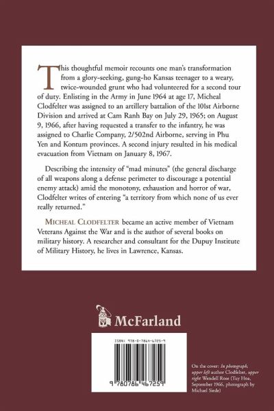 This thoughtful memoir recounts one man's transformation from a glory-seeking, gung-ho Kansas teenager to a weary, twice-wounded grunt who had volunteered for a second tour of duty. Enlisting in the Army in June 1964 at age 17, Micheal Clodfelter was assigned to an artillery battalion of the 101st Airborne Division and arrived at Cam Ranh Bay on July 29, 1965; on August 9, 1966, after having requested a transfer to the infantry, he was assigned to Charlie Company, 2/502nd Airborne, serving in Phu Yen and Kontum provinces. A second injury resulted in his medical evacuation from Vietnam on January 8, 1967. Describing the intensity of ""mad minutes"" (the general discharge of all weapons along a defense perimeter to discourage a potential enemy attack) amid the monotony, exhaustion and horror of war, Clodfelter writes of entering ""a territory from which none of us ever really returned.""