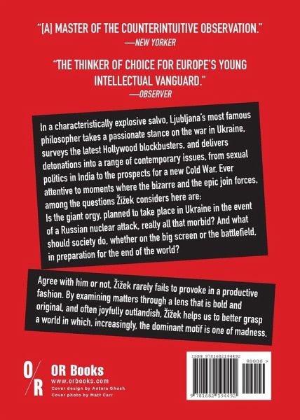 In a characteristically explosive barrage, Ljubljana's most famous philosopher takes a passionate stance on the war in Ukraine, surveys the latest Hollywood blockbusters, and delivers detonations into a range of contemporary issues, from sexual politics in India to the prospects for a new Cold War. Ever attentive to moments where the bizarre and the epic join forces, among the questions iek considers here are: Is the giant orgy, planned to take place in Ukraine in the event of a Russian nuclear attack, really all that morbid? And what should society do, whether on the big screen or the battlefield, in preparation for the end of the world?Agree with him or not, iek rarely fails to provoke in a productive fashion. By examining matters through a lens that is bold and original, and often joyfully outlandish, iek helps us to better grasp a world in which, increasingly, the dominant motif is one of madness.
