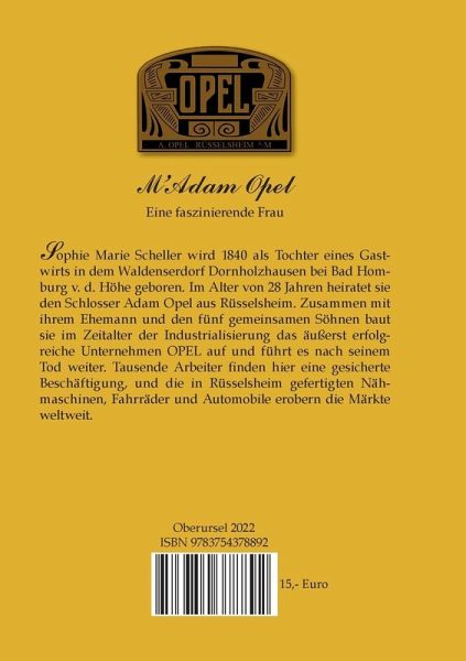 Sophie Marie Scheller wird 1840 als Tochter eines Gastwirts in dem Waldenserdorf Dornholzhausen bei Bad Homburg v. d. Höhe geboren. Im Alter von 28 Jahren heiratet sie den Schlosser Adam Opel aus Rüsselsheim. Zusammen mit ihrem Ehemann und den fünf gemeinsamen Söhnen baut sie im Zeitalter der Industrialisierung das äußerst erfolgreiche Unternehmen OPEL auf und führt es nach seinem Tod weiter. Tausende Arbeiter finden hier eine gesicherte Beschäftigung, und die in Rüsselsheim gefertigten Nähmaschinen, Fahrräder und Automobile erobern die Märkte weltweit.