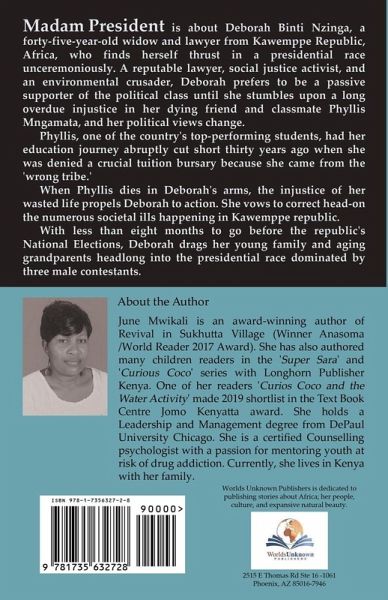 Madam President is about Deborah Binti Nzinga, a forty-five-year-old widow and lawyer from Kawemppe Republic, Africa, who finds herself thrust in a presidential race unceremoniously. A reputable lawyer, social justice activist, and environmental crusader, Deborah prefers to be a passive supporter of the political class until she stumbles upon a long overdue injustice in her dying friend and classmate Phyllis Mngamata, and her political views change. Phyllis, one of the country's top-performing students, had her education journey abruptly cut short thirty years ago when she was denied a crucial tuition bursary because she came from the 'wrong tribe.' When Phyllis dies in Deborah's arms, the injustice of her wasted life propels Deborah to action. She vows to correct head-on the numerous societal ills happening in Kawemppe republic. With less than eight months to go before the republic's National Elections, Deborah drags her young family and aging grandparents headlong into the presidential race dominated by four male contestants.
