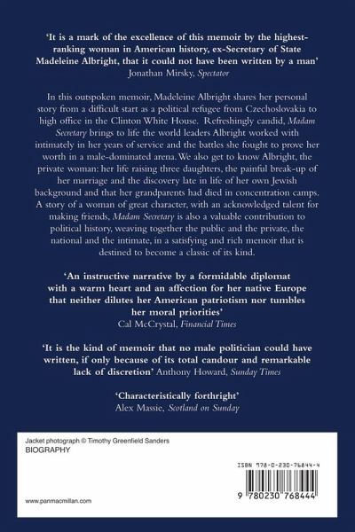 Madeleine K. Albright, born in Czechoslovakia, was confirmed as the 64th Secretary of State in 1997. Her distinguished career in government included positions in the National Security Council and as US ambassador to the United Nations. She lives in Washington D.C. and Virginia