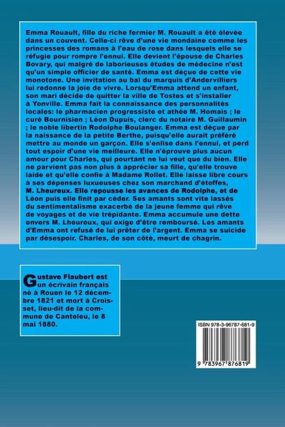 Emma Rouault, fille du riche fermier M. Rouault a été élevée dans un couvent. Celle-ci rêve d'une vie mondaine comme les princesses des romans à l'eau de rose dans lesquels elle se réfugie pour rompre l'ennui. Elle devient l'épouse de Charles Bovary, qui malgré de laborieuses études de médecine n'est qu'un simple officier de santé. Emma est déçue de cette vie monotone. Une invitation au bal du marquis d'Andervilliers lui redonne la joie de vivre. Lorsqu'Emma attend un enfant, son mari décide de quitter la ville de Tostes et s'installer à Yonville. Emma fait la connaissance des personnalités locales: le pharmacien progressiste et athée M. Homais ; le curé Bournisien ; Léon Dupuis, clerc du notaire M. Guillaumin ; le noble libertin Rodolphe Boulanger. Emma est déçue par la naissance de la petite Berthe, puisqu'elle aurait préféré mettre au monde un garçon. Elle s'enlise dans l'ennui, et perd tout espoir d'une vie meilleure. Elle n'éprouve plus aucun amour pour Charles, qui pourtant ne lui veut que du bien. Elle ne parvient pas non plus à apprécier sa fille, qu'elle trouve laide et qu'elle confie à Madame Rollet. Elle laisse libre cours à ses dépenses luxueuses chez son marchand d'étoffes, M. Lheureux. Elle repousse les avances de Rodolphe, et de Léon puis elle finit par céder. Ses amants sont vite lassés du sentimentalisme exacerbé de la jeune femme qui rêve de voyages et de vie trépidante. Emma accumule une dette envers M. Lheureux, qui exige d'être remboursé. Les amants d'Emma ont refusé de lui prêter de l'argent. Emma se suicide par désespoir. Charles, de son côté, meurt de chagrin.