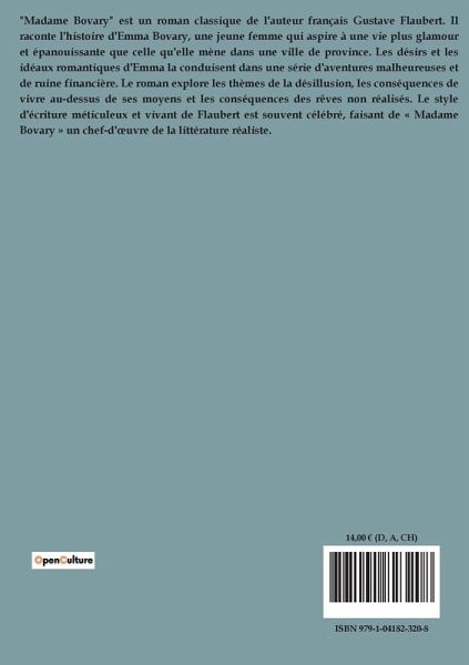 "Madame Bovary" est un roman classique de l'auteur français Gustave Flaubert. Il raconte l'histoire d'Emma Bovary, une jeune femme qui aspire à une vie plus glamour et épanouissante que celle qu'elle mène dans une ville de province. Les désirs et les idéaux romantiques d'Emma la conduisent dans une série d'aventures malheureuses et de ruine financière. Le roman explore les thèmes de la désillusion, les conséquences de vivre au-dessus de ses moyens et les conséquences des rêves non réalisés. Le style d'écriture méticuleux et vivant de Flaubert est souvent célébré, faisant de « Madame Bovary » un chef-d'¿uvre de la littérature réaliste.
