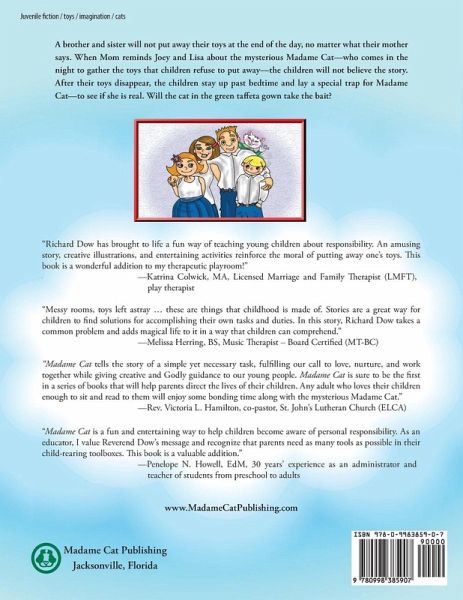Richard Dow is an ordained Lutheran pastor currently serving an interim ministry for the Florida-Bahamas Synod of the Evangelical Lutheran Church in America. He has taught public speaking and religions at a local college, and has a love of classic cars and old movies. As a dad with a wry sense of humor, Richard first brought Madame Cat to life as a bedtime story for the Dow children, and now for two grandsons. Richard lives with his wife, Melissa, in Jacksonville, Florida, along with a host of new story characters just waiting to be introduced to his grandchildren.