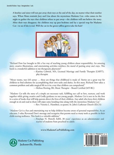A brother and sister will not put away their toys at the end of the day, no matter what their mother says. When Mom reminds Joey and Lisa about the mysterious Madame Cat-who comes in the night to gather the toys that children refuse to put away-the children will not believe the story. After their toys disappear, the children stay up past bedtime and lay a special trap for Madame Cat-to see if she is real. Will the cat in the green taffeta gown take the bait?