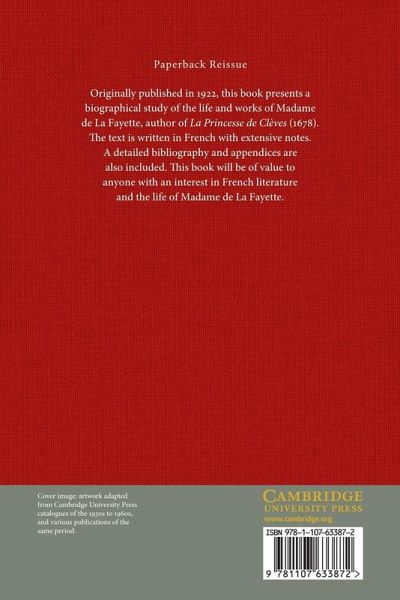 Originally published in 1922, this book presents a biographical study of the life and works of Madame de La Fayette, author of La Princesse de Clèves (1678). The text is written in French with extensive notes. A detailed bibliography and appendices are also included. This book will be of value to anyone with an interest in French literature and the life of Madame de La Fayette.