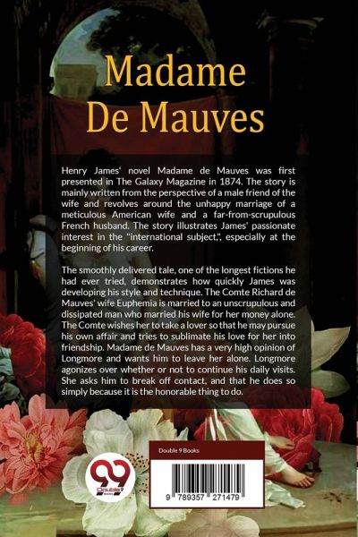 Henry James' novel Madame de Mauves was first presented in The Galaxy Magazine in 1874. The story is mainly written from the perspective of a male friend of the wife and revolves around the unhappy marriage of a meticulous American wife and a far-from-scrupulous French husband. The story illustrates James' passionate interest in the "international subject,", especially at the beginning of his career. The smoothly delivered tale, one of the longest fictions he had ever tried, demonstrates how quickly James was developing his style and technique. The Comte Richard de Mauves' wife Euphemia is married to an unscrupulous and dissipated man who married his wife for her money alone. The Comte wishes her to take a lover so that he may pursue his own affair and tries to sublimate his love for her into friendship. Madame de Mauves has a very high opinion of Longmore and wants him to leave her alone. Longmore agonizes over whether or not to continue his daily visits. She asks him to break off contact, and that he does so simply because it is the honorable thing to do.
