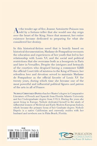 At the tender age of five, Jeanne Antoinette Poisson was told by a fortune-teller that she would one day reign over the heart of the King. Since that moment, her entire existence became dedicated to preparing for what she considered her destiny. In this historical-fiction novel that is heavily based on historical documentation, Madame de Pompadour recounts the education and experiences of her youth that led to her relationship with Louis XV, and the social and political restrictions that she overcame both as a bourgeois in Paris and later in Versailles. Despite the intrigues and betrayals of the courtiers who despised having a commoner fulfill the official Court title of mistress to the King of France, her relentless love and devotion served to maintain Madame de Pompadour as the official favorite of Louis XV for twenty years, during which time she became one of the most powerful and influential political figures and patron of the arts in all of France.