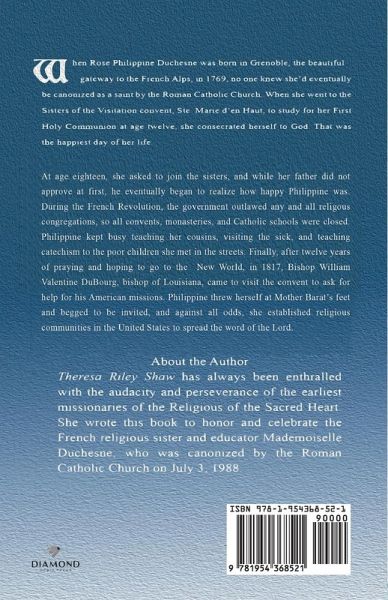 When Rose Philippine Duchesne was born in Grenoble, the beautiful gateway to the French Alps, in 1769, no one knew she'd eventually be canonized as a saint by the Roman Catholic Church. When she went to the Sisters of the Visitation convent, Ste. Marie d' en Haut, to study for her First Holy Communion at age twelve, she consecrated herself to God. That was the happiest day of her life. At age eighteen, she asked to join the sisters, and while her father did not approve at first, he eventually began to realize how happy Philippine was. During the French Revolution, the government outlawed any and all religious congregations, so all convents, monasteries, and Catholic schools were closed. Philippine kept busy teaching her cousins, visiting the sick, and teaching catechism to the poor children she met in the streets. Finally, after twelve years of praying and hoping to go to the New World, in 1817, Bishop William Valentine DuBourg, bishop of Louisiana, came to visit the convent to ask for help for his American missions. Philippine threw herself at Mother Barat's feet and begged to be invited, and against all odds, she established religious communities in the United States to spread the word of the Lord. About the AuthorTheresa Riley Shaw has always been enthralled with the audacity and perseverance of the earliest missionaries of the Religious of the Sacred Heart. She wrote this book to honor and celebrate the French religious sister and educator Mademoiselle Duchesne, who was canonized by the Roman Catholic Church on July 3, 1988.