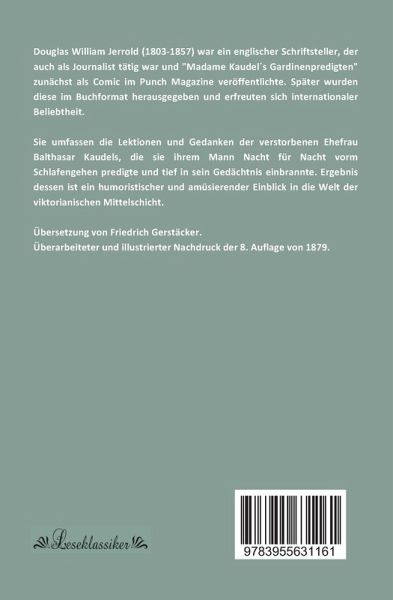 Douglas William Jerrold (1803-1857) war ein englischer Schriftsteller, der auch als Journalist tätig war und "Madame Kaudel s Gardinenpredigten" zunächst als Comic im Punch Magazine veröffentlichte. Später wurden diese im Buchformat herausgegeben und erfreuten sich internationaler Beliebtheit.