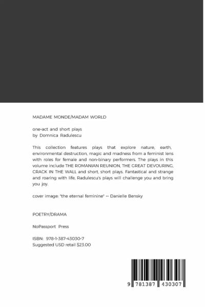 MADAME MONDE/MADAM WORLD. one-act and short plays by Domnica Radulescu. A collection that features a wide range of plays that focus on nature, earth, madness, magic, and environmental destruction from a feminist lens with great roles for female and non-binary performers. Wild, poetic and daring plays that provoke joy. This is a NoPassport Press publication project.