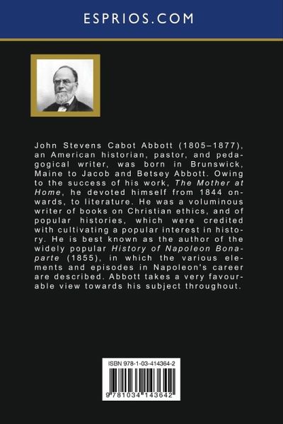 John Stevens Cabot Abbott (1805-1877), an American historian, pastor, and pedagogical writer, was born in Brunswick, Maine to Jacob and Betsey Abbott. Owing to the success of his work, The Mother at Home, he devoted himself from 1844 onwards, to literature. He was a voluminous writer of books on Christian ethics, and of popular histories, which were credited with cultivating a popular interest in history. He is best known as the author of the widely popular History of Napoleon Bonaparte (1855), in which the various elements and episodes in Napoleon's career are described. Abbott takes a very favourable view towards his subject throughout.…mehr