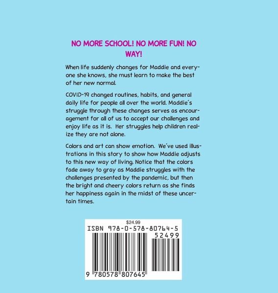 When life suddenly changes for Maddie and everyone she knows, she must learn to make the best of her new normal. COVID-19 changed routines, habits, and general daily life for people all over the world. Maddie's struggle through these changes serves as encouragement for all of us to accept our challenges and enjoy life as it is. Her struggles help children realize they are not alone. Colors and art can show emotion. We've used illustrations in this story to show how Maddie adjusts to this new way of living. Colors in art can represent and spark various emotions. In the book, notice how the colors in the illustrations slowly fade to gray reflecting Maddie's feelings. As she is impacted by the pandemic, she is overwhelmed and sad. Thus, the colors begin to fade away along with her happiness. When Maddie begins to adjust and find joy in her new normal, the color and cheer is added back to her world. The author's hope is that Maddie's story can help the reader accept the changes in the world and begin to find color and happiness!