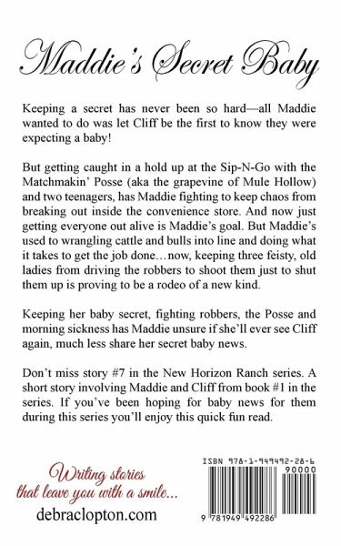 Keeping a secret has never been so hard-all Maddie wanted to do was let Cliff be the first to know they were expecting a baby! But getting caught in a hold up at the Sip-N-Go with the Matchmakin' Posse (aka the grapevine of Mule Hollow) and two teenagers, has Maddie fighting to keep chaos from breaking out inside the convenience store. And now just getting everyone out alive is Maddie's goal. But Maddie's used to wrangling cattle and bulls into line and doing what it takes to get the job done…now, keeping three feisty, old ladies from driving the robbers to shoot them just to shut them up is proving to be a rodeo of a new kind. Keeping her baby secret, fighting robbers, the Posse and morning sickness has Maddie unsure if she'll ever see Cliff again, much less share her secret baby news. Don't miss story #7 in the New Horizon Ranch series. A short story involving Maddie and Cliff from book #1 in the series. If you've been hoping for baby news for them during this series you'll enjoy this quick fun read.