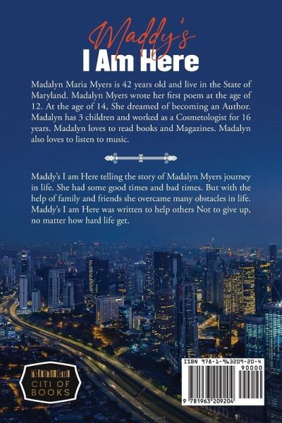 Maddy's I am Here telling the story of Madalyn Myers journey in life. She had some good times and bad times. But with the help of family and friends she overcame many obstacles in life. Maddy's I am Here was written to help others Not to give up, no matter how hard life get.
