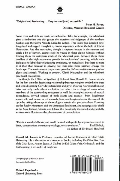 In this book, the author details for the first time this fascinating relationship between wingless-seeded pine trees and seed-dispersing Corvids (nutcrackers and jays), showing how mutualism can drive not only each others' evolution, but affect the ecology of many other members of the surrounding ecosystem as well. Focusing on the Rocky Mountains and the American Southwest, and ranging as far afield as the Alps, Finland, Siberia, and China, this beautifully illustrated and gracefully written work illuminates the phenomenon of co-evolution.