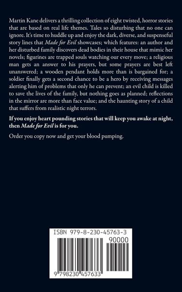 What happens when a family finds dead bodies in their house? Or when mirror reflections are not what they seem? The horror is here for you to read. Martin Kane delivers a thrilling collection of seven twisted, horror stories that are based on real life themes. Tales so disturbing that no one can ignore. It's time to huddle up and enjoy the dark, diverse, and suspenseful story lines that Made for Evil showcases. Featured in this anthology:An author and her disturbed family discovers dead bodies in their house that mimic her novels; Family members begin to disappear during a family reunion, but are forced to live it. A religious man gets an answer but with the wrong life; A slave who possesses a wooden pendant and discovers what is truly hidden; A soldier finally gets a second chance to be a hero by receiving messages alerting him of problems that only he can prevent; An evil child is killed to save the lives of the family but nothing goes as planned; Reflections in the mirror are more than face value; and The haunting story of a child that suffers from realistic night terrors. If you enjoy heart pounding stories that will keep you awake at night, then Made for Evil is for you. Order you copy now and get your blood pumping.