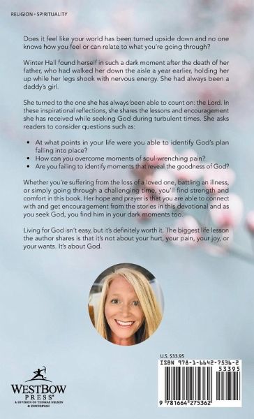 Does it feel like your world has been turned upside down and no one knows how you feel or can relate to what you're going through? Winter Hall found herself in such a dark moment after the death of her father, who had walked her down the aisle a year earlier, holding her up while her legs shook with nervous energy. She had always been a daddy's girl. She turned to the one she has always been able to count on: the Lord. In these inspirational reflections, she shares the lessons and encouragement she has received while seeking God during turbulent times. She asks readers to consider questions such as: ¿ At what points in your life were you able to identify God's plan falling into place? ¿ How can you overcome moments of soul-wrenching pain? ¿ Are you failing to identify moments that reveal the goodness of God? Whether you're suffering from the loss of a loved one, battling an illness, or simply going through a challenging time, you'll find strength and comfort in this book. Her hope and prayer is that you are able to connect with and get encouragement from the stories in this devotional and as you seek God, you find him in your dark moments too. Living for God isn't easy, but it's definitely worth it. The biggest life lesson the author shares is that it's not about your hurt, your pain, your joy, or your wants. It's about God.