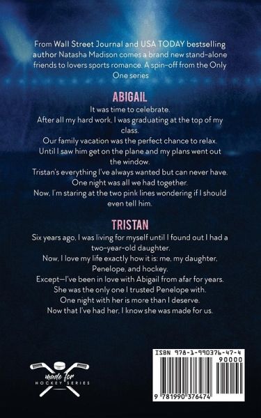 From Wall Street Journal and USA TODAY bestselling author Natasha Madison comes a brand new stand-alone surprise pregnancy single dad sports romance. A spin-off from the Only One series & This Is Series. Made For Us Abigail It was time to celebrate. After all my hard work, I was graduating at the top of my class. Our family vacation was the perfect chance to relax. Until I saw him get on the plane and my plans went out the window. Tristan's everything I've always wanted but can never have. One night was all we had together. Now, I'm staring at the two pink lines wondering if I should even tell him. Tristan Six years ago, I was living for myself until I found out I had a two-year-old daughter. Now, I love my life exactly how it is: me, my daughter and hockey. Except-I've been in love with Abigail from afar for years. She was the only one I trusted my daughter with. One night with her is more than I deserve. Now that I've had her, I know she was made for us.