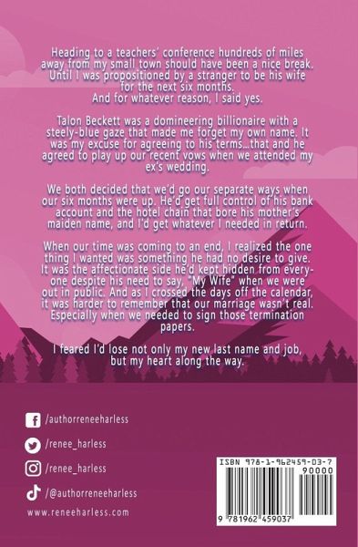 Heading to a teachers' conference hundreds of miles away from my small town should have been a nice break. Until I was propositioned by a stranger to be his wife for the next six months. And for whatever reason, I said yes. Talon Beckett was a domineering billionaire with a steely-blue gaze that made me forget my own name. It was my excuse for agreeing to his terms...that and he agreed to play up our recent vows when we attended my ex's wedding. We both decided that we'd go our separate ways when our six months were up. He'd get full control of his bank account and the hotel chain that bore his mother's maiden name, and I'd get whatever I needed in return. When our time was coming to an end, I realized the one thing I wanted was something he had no desire to give. It was the affectionate side he'd kept hidden from everyone despite his need to say, "My Wife" when we were out in public. And as I crossed the days off the calendar, it was harder to remember that our marriage wasn't real. Especially when we needed to sign those termination papers. I feared I'd lose not only my new last name and job, but my heart along the way.