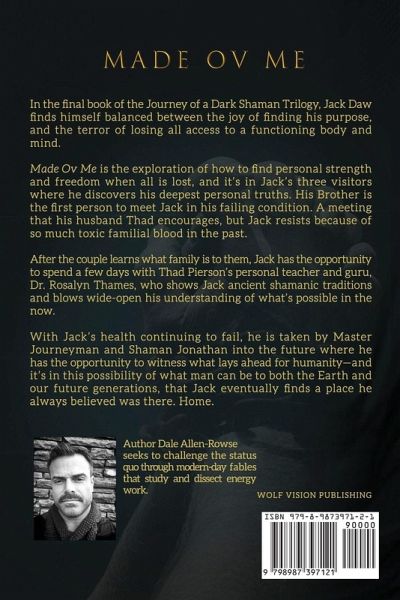 In the final book of the Journey of a Dark Shaman Trilogy, Jack Daw finds himself balanced between the joy of finding his purpose, and the terror of losing all access to a functioning body and mind. Made Ov Me is the exploration of how to find personal strength and freedom when all is lost, and it's in Jack's three visitors where he discovers his deepest personal truth. His brother is the first person to meet Jack in his failing condition. A meeting that his husband Thad encourages, but Jack resists because of so much toxic familial blood in the past. After the couple learns what family is to them, Jack has the opportunity to spend a few days with Thad Pierson's personal teacher and guru, Dr. Rosalyn Thames, who shows Jack ancient shamanic traditions and blows wide-open his understanding of what's possible in the now. With Jack's health continuing to fail, he is taken by Master Journeyman and Shaman Jonathon into the future where he has the opportunity to witness what lays ahead for humanity- and it's in this possibility of what man can be to both the Earth and our future generations, that Jack eventually finds a place he always believed was there. Home.