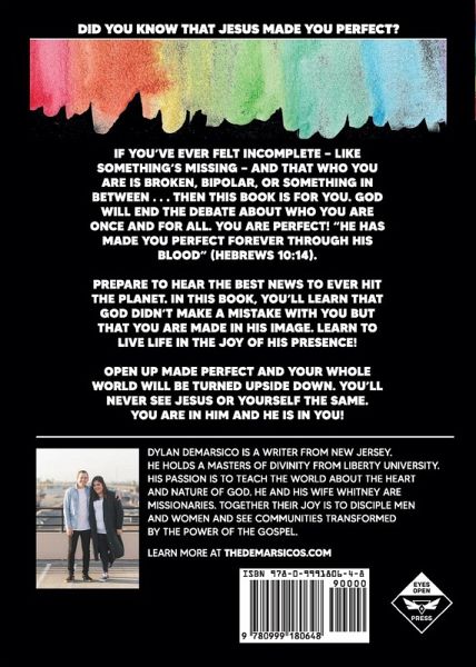 If you've ever felt incomplete - like something's missing - and that who you are is broken, bipolar, or something in between . . . then this book is for you. God will end the debate about who you are once and for all. You are perfect! "He has made you perfect forever through His blood" (Hebrews 10:14). Prepare to hear the best news to ever hit the planet. In this book, you'll learn that God didn't make a mistake with you but that you are made in His image. Learn to live life in the joy of His presence! Open up Made Perfect and your whole world will be turned upside down. You'll never see Jesus or yourself the same. You are in Him and He is in you!