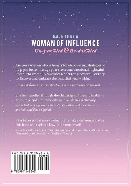 WORLD CHANGING INFLUENCE Influence changes everything How do you influence? By living life to the full and sharing the overflow of that to others? Or living life with a long crabby face as a result of the inner heart issues and spreading that around instead? Personally I walked a million miles with a sour heart and that story will unfold through the pages of this book as I describe inner transformation that is possible for all of us. Perhaps like me you have lived grumpy too. In some way or other, we are all exerting some sort of effect, good or bad, often without realising it…in positive or less-than-positive ways. When we smile, when we encourage or when we feel low, we’re impacting others in some way. Creating ripples! If we take time to develop our inner well-being then we can build and inspire to bring life to others as we outwork what God originally intended. We were created at this time and place for a purpose to influence well. Here are some of the daily issues we women face: Caring for families. Women are generally the carers for both the children and older family members; Hormones—when some of us might be a nightmare to live with; Being busy—filling many roles with limited time to fulfill them; Multi-focussed—juggling home, work and the whole world. Today’s young women have more to negotiate than their mothers did at the same age. As a result, our ripples may not extend in good ways due to a lack of fresh flowing input and time from our Maker. This book has been written to help you discover what you need to become a world changer and a beautiful influence in the process. We will journey together, trekking into what may seem uncertain territory. At times the expedition will probably feel unfamiliar and foreign. But I assure you the destination is magnificent. It’s a place where others in your world are impacted by the woman you are meant to be. God-created and God-breathed, for a unique purpose. It may seem a million miles away right now. But will you trust me, take the plunge and begin? In the pages of this book we will travel on three journeys across three sections. Together, we’ll move from crazy, stressed and frazzled lives to God-inspired peace in the first. In the second, we will dislodge some heavy, emotional baggage, to relocate to a place of un-frazzled freedom. And then lastly in the final section, we’ll navigate from negative self-image or low self-esteem to confidence, purpose and a dazzling new you! Un-frazzled Peace— Finding, accessing and remaining in God’s peace whilst living in a crazy world; Un-frazzled Freedom— Discovering and dealing with emotional baggage that creates personal and relational tension; Dazzling Influence — Uncovering divine inner beauty and strength to outwardly shine the love of God. Open it at any section or chapter to get strategies for your situation if you are in the midst of a crisis needing immediate solutions. But if you prefer systematic reading, you can start from the beginning, processing each section step by step. Like me, do y