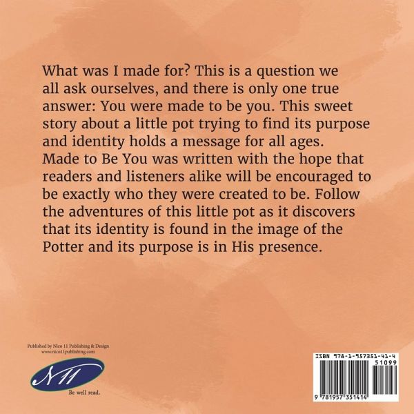 What was I made for? This is a question we all ask ourselves, and there is only one true answer: You were made to be you. This sweet story about a little pot trying to find its purpose and identity holds a message for all ages. Made to Be You was written with the hope that readers and listeners alike will be encouraged to be exactly who they were created to be. Follow the adventures of this little pot as it discovers that its identity is found in the image of the Potter and its purpose is in His presence.