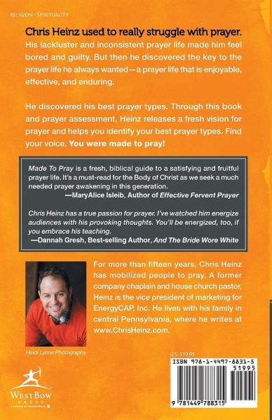 CS Heinz used to really struggle with prayer. His lackluster and inconsistent prayer life made him feel bored and guilty. But then he discovered the key to the prayer life he always wanted—a prayer life that is enjoyable, effective, and enduring. He discovered his best prayer types. Through this book and online prayer assessment, Heinz helps you identify your best prayer types so you can have a better time with God. Find your voice. You were made to pray! This book could radically change how you see God, your life, and your ministry. I believe Made to Pray will quickly find itself on your "best prayer books" list. —Dr. Doug Shaw, President/CEO of International Students, Inc. CS Heinz has a true passion for prayer. I’ve watched him energize audiences with his provoking thoughts. You’ll be energized, too, if you embrace his teaching. —Dannah Gresh, Best-selling Author, And The Bride Wore White