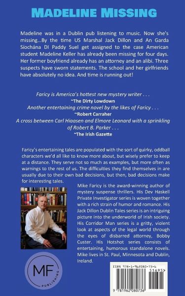 Madeline Missing: Jack Dillon Dublin Tale 7: Second Edition Madeline was in a Dublin pub listening to music. Now she's missing...By the time US Marshal Jack Dillon and An Garda Síochána DI Paddy Suel get assigned to the case, American student Madeline Keller has already been missing for four days. Her former boyfriend already has an attorney and an alibi. Three suspects have sworn statements. The school and her girlfriends have absolutely no idea. And time is running out! Faricy is America's hottest new mystery writer . . . ~The Dirty Lowdown Another entertaining crime novel by the likes of Faricy . . . ~Robert Carraher A cross between Carl Hiaasen and Elmore Leonard with a sprinkling of Robert B. Parker . . . ~The Irish Gazette Faricy's entertaining tales are populated with the sort of quirky, oddball characters we'd all like to know more about but wisely prefer to keep at a distance. They serve not so much as examples but more often as warnings to the rest of us. The difficulties they find themselves in are usually due to their own bad decisions, but bad decisions make for interesting tales.