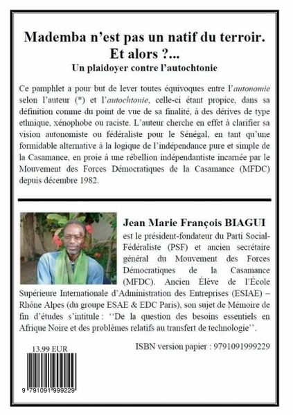 Ce pamphlet a pour but de lever toutes équivoques entre l'autonomie selon l'auteur (*) et l'autochtonie, celle-ci étant propice, dans sa définition comme du point de vue de sa finalité, à des dérives de type ethnique, xénophobe ou raciste. L'auteur cherche en effet à clarifier sa vision autonomiste ou fédéraliste pour le Sénégal, en tant qu'une formidable alternative à la logique de l'indépendance pure et simple de la Casamance, en proie à une rébellion indépendantiste incarnée par le Mouvement des Forces Démocratiques de la Casamance (MFDC) depuis décembre 1982.