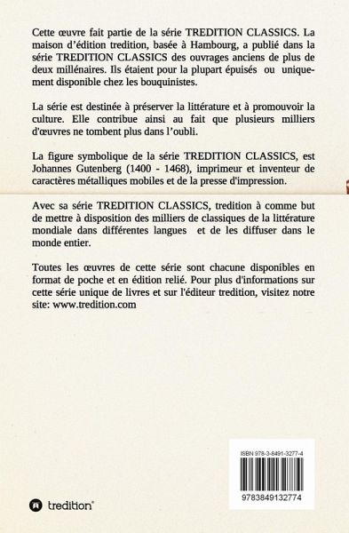 Cette uvre fait partie de la série TREDITION CLASSICS. La maison d édition tredition, basée à Hambourg, a publié dans la série TREDITION CLASSICS des ouvrages anciens de plus de deux millénaires. Ils étaient pour la plupart épuisés ou unique-ment disponible chez les bouquinistes. La série est destinée à préserver la littérature et à promouvoir la culture. Avec sa série TREDITION CLASSICS, tredition à comme but de mettre à disposition des milliers de classiques de la littérature mondiale dans différentes langues et de les diffuser dans le monde entier.