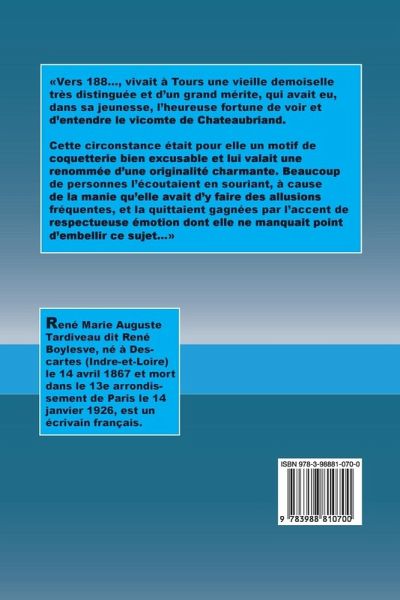 Vers 188..., vivait à Tours une vieille demoiselle très distinguée et d'un grand mérite, qui avait eu, dans sa jeunesse, l'heureuse fortune de voir et d'entendre le vicomte de Chateaubriand. Cette circonstance était pour elle un motif de coquetterie bien excusable et lui valait une renommée d'une originalité charmante. Beaucoup de personnes l'écoutaient en souriant, à cause de la manie qu'elle avait d'y faire des allusions fréquentes, et la quittaient gagnées par l'accent de respectueuse émotion dont elle ne manquait point d'embellir ce sujet...