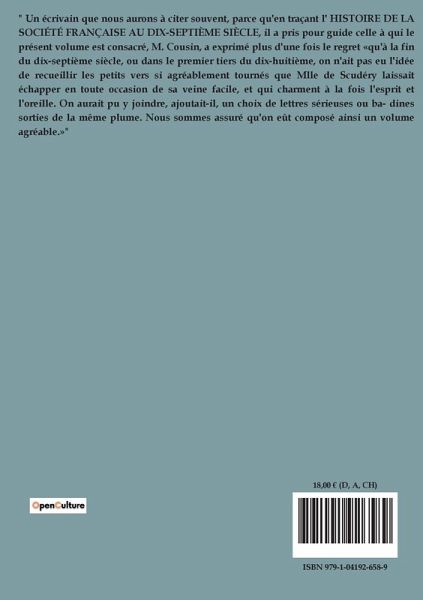 " Un écrivain que nous aurons à citer souvent, parce qu'en traçant l' HISTOIRE DE LA SOCIÉTÉ FRANÇAISE AU DIX-SEPTIÈME SIÈCLE, il a pris pour guide celle à qui le présent volume est consacré, M. Cousin, a exprimé plus d'une fois le regret «qu'à la fin du dix-septième siècle, ou dans le premier tiers du dix-huitième, on n'ait pas eu l'idée de recueillir les petits vers si agréablement tournés que Mlle de Scudéry laissait échapper en toute occasion de sa veine facile, et qui charment à la fois l'esprit et l'oreille. On aurait pu y joindre, ajoutait-il, un choix de lettres sérieuses ou ba- dines sorties de la même plume. Nous sommes assuré qu'on eût composé ainsi un volume agréable.»"