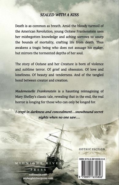 SEALED WITH A KISS Death is as common as breath. Amid the bloody turmoil of the American Revolution, young Océane Frankenstein uses her misbegotten knowledge and aching sorrows to usurp the bounds of mortality, crafting life from death. Thus awakens a tragic being who does not assuage his maker, but mirrors the tormented depths of her soul. The story of Océane and her Creature is born of violence and sublime terror. Of grief and obsession. Of love and loneliness. Of beauty and tenderness. And of the tangled bond between creator and creation. Mademoiselle Frankenstein is a haunting reimagining of Mary Shelley's classic tale, revealing that in the end, the real horror is longing for those who can only be longed for.