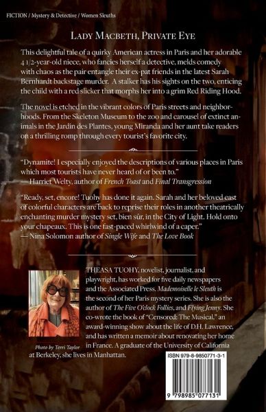 This delightful tale of a quirky American actress in Paris and her adorable 4 /12-year-old niece, who fancies herself a detective, melds comedy with chaos as the two entangle their ex-pat friends in the latest Sarah Bernhardt backstage murder. A stalker has his sights on the two, enticing the child with a red slicker that morphs her into a grim Red Riding Hood. The novel is etched in the vibrant colors of Paris streets and neighborhoods. From the Skeleton Museum to the zoo and carousel of extinct animals in the Jardin des Plantes, young Miranda and her aunt take readers on a thrilling romp through every tourist's favorite city.…mehr
