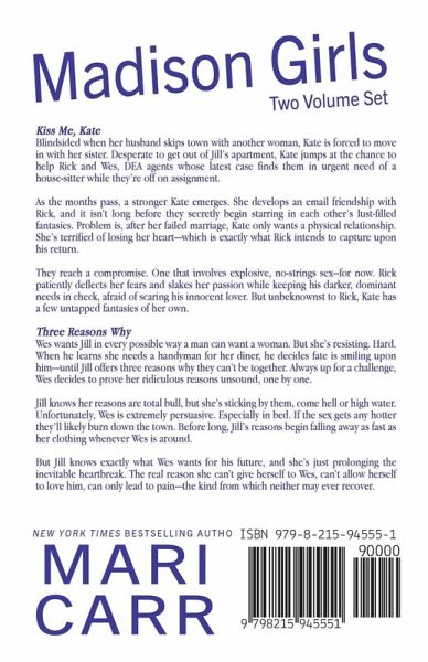 KISS ME KATE Who says she can't start over with the bad boy? Blindsided when her husband skips town with another woman, Kate jumps at the chance to help Rick, a DEA agent whose latest case finds him in need of a house-sitter. Soon, Kate and Rick begin starring in each other's lust-filled fantasies. When Rick exposes Kate to his darker, dominant needs, he quickly realizes she has a few untapped fantasies of her own. Problem is, after her failed marriage, Kate only wants a physical relationship. She's terrified of losing her heart-which is exactly what Rick wants. They reach a sexy compromise. One that involves explosive, no-strings sex. But only for now. Because Rick isn't going to stop until Kate is his forever. And he's not above seducing her all the way there. THREE REASONS WHY Wes wants Jill in every possible way a man can want a woman. But she's resisting. When he learns she needs a handyman for her diner, he decides fate is smiling upon him-until Jill offers three reasons why they can't be together. Always up for a challenge, Wes decides to prove her ridiculous reasons wrong, one by one. Jill sticking to her guns. Unfortunately, Wes is extremely persuasive. Especially in bed. If the sex gets any hotter they'll likely burn down the town. Before long, Jill's reasons begin falling away as fast as her clothing whenever Wes is around. But the real reason she can't give herself to Wes, can't allow herself to love him, can only lead to pain-the kind from which neither may ever recover.