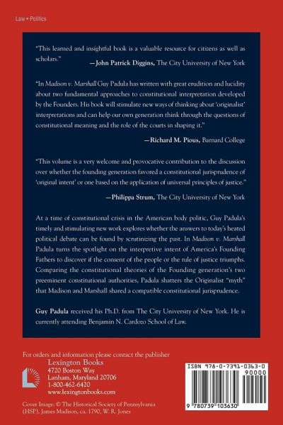 Popular Sovereignty or Natural Law? At a time of constitutional crisis in the American body politic, Guy Padula's timely and stimulating new work explores whether the answers to today's heated political debate can be found by scrutinizing the past. In Madison v. Marshall Padula turns the spotlight on the interpretive intent of America's Founding Fathers to discover if the consent of the people or the rule of justice triumphs. Comparing the constitutional theories of the Founding generation's two preeminent constitutional authorities, Padula shatters the Originalist myth that Madison and Marshall shared a compatible constitutional jurisprudence. He concludes that the meaning of the Constitution has been contested from the outset. This is essential reading for legal scholars, political scientists and historians seeking to learn more about the fundamental nature of U.S. law and how it should be interpreted.