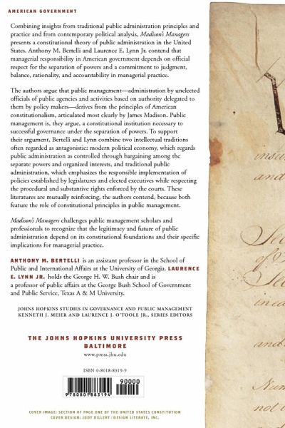 Combining insights from traditional thought and practice and from contemporary political analysis, Madison's Managers presents a constitutional theory of public administration in the United States. Anthony Michael Bertelli and Laurence E. Lynn Jr. contend that managerial responsibility in American government depends on official respect for the separation of powers and a commitment to judgment, balance, rationality, and accountability in managerial practice. The authors argue that public management-administration by unelected officials of public agencies and activities based on authority delegated to them by policymakers-derives from the principles of American constitutionalism, articulated most clearly by James Madison. Public management is, they argue, a constitutional institution necessary to successful governance under the separation of powers. To support their argument, Bertelli and Lynn combine two intellectual traditions often regarded as antagonistic: modern political economy, which regards public administration as controlled through bargaining among the separate powers and organized interests, and traditional public administration, which emphasizes the responsible implementation of policies established by legislatures and elected executives while respecting the procedural and substantive rights enforced by the courts. These literatures are mutually reinforcing, the authors argue, because both feature the role of constitutional principles in public management. Madison's Managers challenges public management scholars and professionals to recognize that the legitimacy and future of public administration depend on its constitutional foundations and their specific implications for managerial practice.