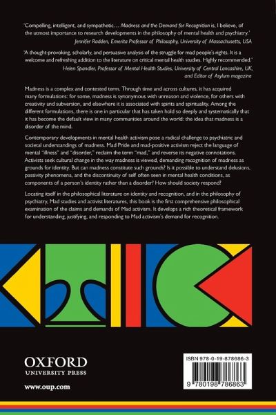 Part 1: Madness 1: Mental health activism and the demand for recognition 2: The problem of distress and disability Part 2: Recognition 3: The concept of recognition and the problem of freedom 4: Identity and the psychological consequences of recognition 5: Misrecognition: Political reform or reconciliation? Part 3: Routes to recognition 6: Mad culture 7: Mad identity I: Controversial and failed identities 8: Mad identity II: Unity and continuity of self 9: Madness and the limits of recognition Part 4: Approaches to Mad Activism 10: Responding to the demand for recognition of Mad identity 11: Conclusion: Pathways to reconciliation