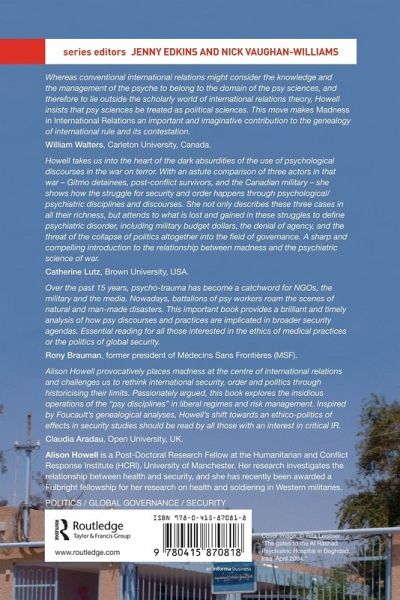 1. Madness in IR: An Introduction 2. Security, Order, Control: From Anti-Politics to Ethico Politics 3. Approaching Madness:the Psy Disciplines in Critical Perspective 4. Victims or Madmen? The Diagnostic Competition over 'Terrorist' Detainees at Guantánamo Bay 5. The Diagnostic Competition over Post-Conflict Populations: Merging the Psychosocial and Mental Health Models 6. Ordering Soldiers: Contesting Therapeutic Practices in the Canadian Military 7. Conclusion: The Global Politics of Governing Mental Health