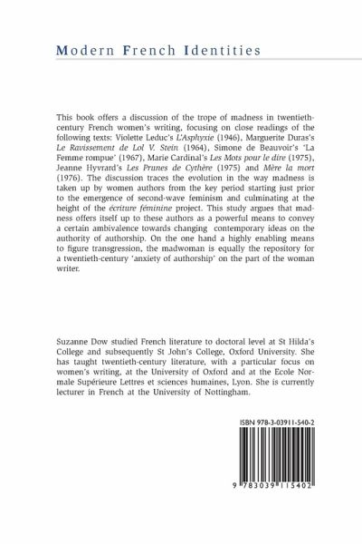 This book offers a discussion of the trope of madness in twentieth-century French women's writing, focusing on close readings of the following texts: Violette Leduc's L'Asphyxie (1946), Marguerite Duras's Le Ravissement de Lol V. Stein (1964), Simone de Beauvoir's 'La Femme rompue' (1967), Marie Cardinal's Les Mots pour le dire (1975), Jeanne Hyvrard's Les Prunes de Cythère (1975) and Mère la mort (1976). The discussion traces the evolution in the way madness is taken up by women authors from the key period starting just prior to the emergence of second-wave feminism and culminating at the height of the écriture féminine project. This study argues that madness offers itself up to these authors as a powerful means to convey a certain ambivalence towards changing contemporary ideas on the authority of authorship. On the one hand a highly enabling means to figure transgression, the madwoman is equally the repository for a twentieth-century 'anxiety of authorship' on the part of the woman writer.