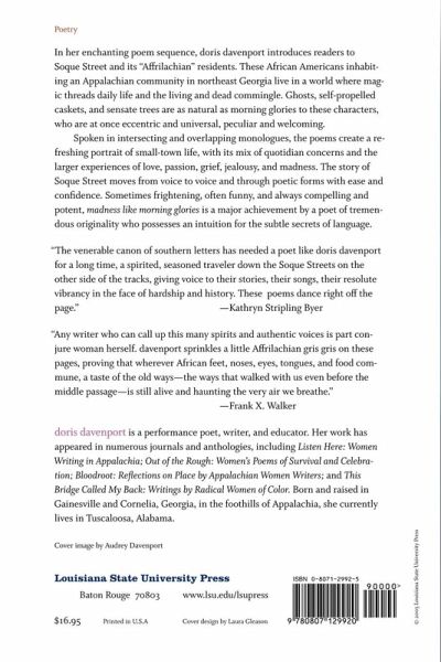 In her enchanting poem sequence, Doris Davenport introduces readers to Soque Street and its "Affrilacian" residents. These African Americans inhabiting an Appalachian community in northeast Georgia live in a world where magic threads daily life and the living and dead commingle. Ghosts, self-propelled caskets, and sensate trees are as natural as morning glories to these characters, who are at once eccentric and universal, peculiar and welcoming. Spoken in intersecting and overlapping monologues, the poems create a refreshing portrait of small-town life, with its mix of quotidian concerns and the larger experiences of love, passion, grief, jealousy, and madness. The story of Soque Street moves from voice to voice and through poetic forms with ease and confidence. Sometimes frightening, often funny, and always compelling and potent, Madness like Morning Glories is a major achievement by a poet of tremendous originality who possesses an intuition for the subtle secrets of language.
